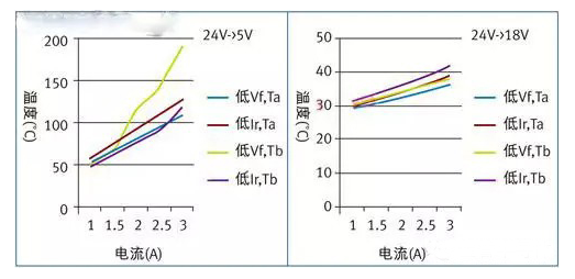 同樣,從中也能看到輸入輸出電壓比的效果。左側(cè)顯示的是5V輸出、低占空比直流/直流轉(zhuǎn)換器。占空比較低意味著T2較長,PT2就更多。因此,較多的初始熱量導(dǎo)致Ir增加更快,PT1更高。最終結(jié)果就是隨著輸出電流增加,二極管溫度迅速上升。在較高的電流下,可以看到事實(shí)上溫度已超出了指定范圍之外。右側(cè)顯示較高的18V輸出電壓導(dǎo)致更高的占空比,從而抑制了PT2。二極管內(nèi)較少的發(fā)熱量意味著Ir增加較少,因此,PT1和總體溫度也都增加較少。