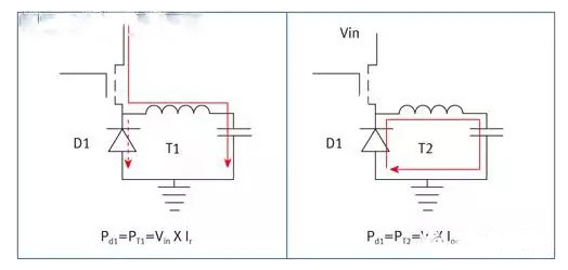 當(dāng)時(shí)間為T2時(shí),輸出電流(Iout)流經(jīng)D1。所產(chǎn)生的損耗與D1的正向電壓(Vfw)和輸出電流直接相關(guān)。PT2等于Iout*Vfw。顯然,我們希望盡可能降低以控制損耗,減少發(fā)熱。